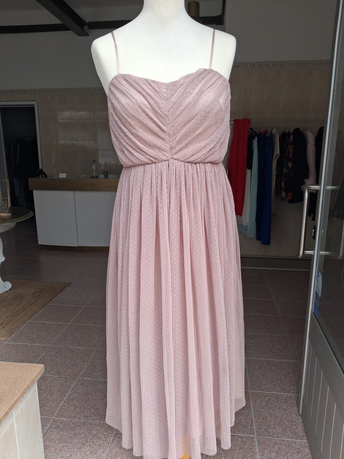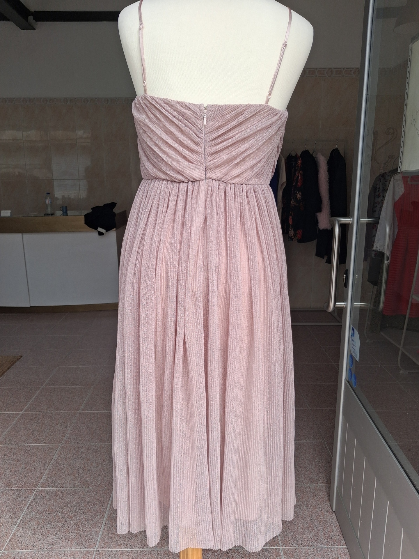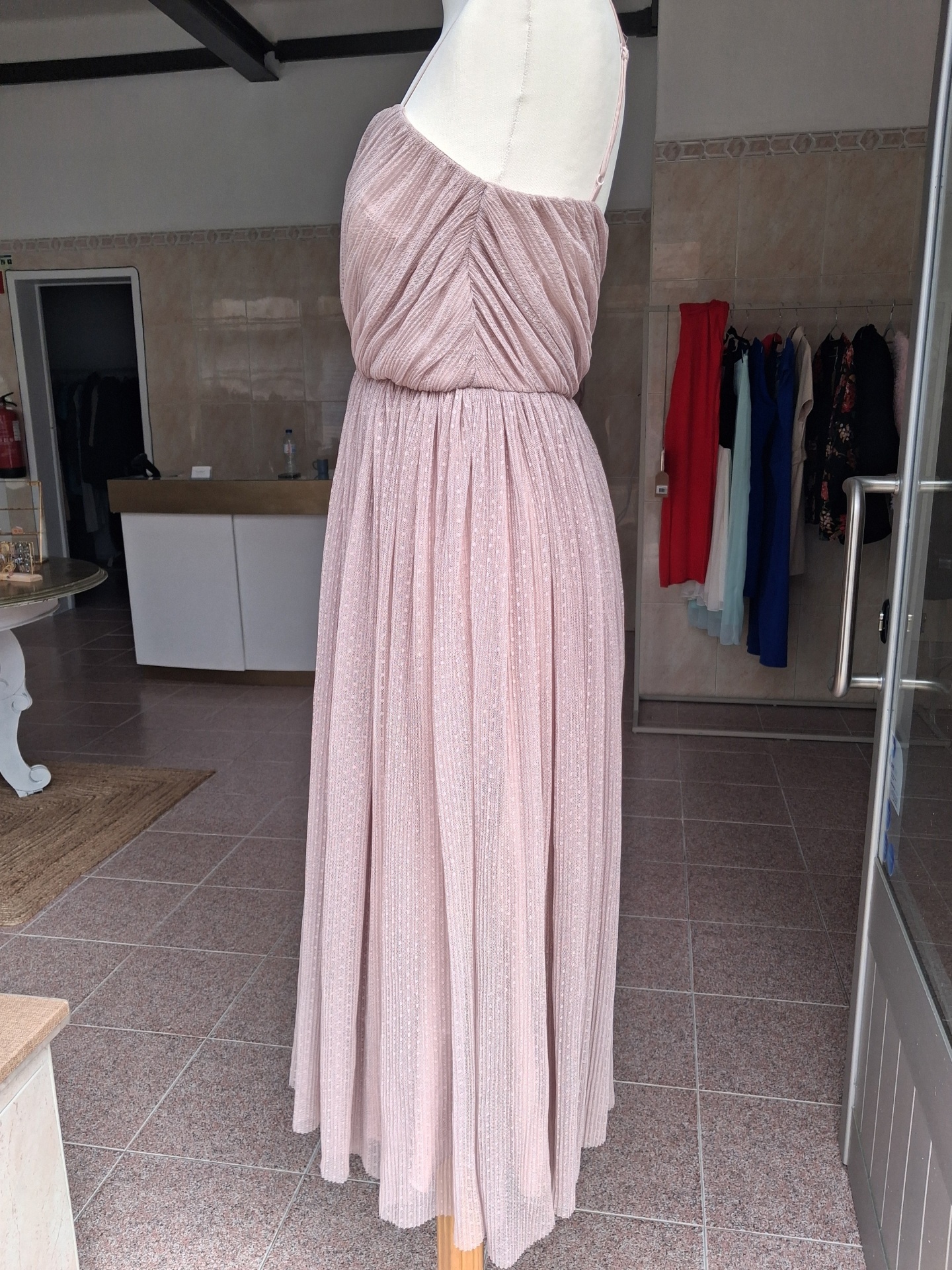Tamanho: 36 (cintura 38cm; comprimento 100cm) Design: Saia longa plissada, decote com efeito cruzado e alças finas. Tecido: Chiffon leve com forro interior para total conforto. Estado: Perfeito. Ideal para: Madrinhas, convidadas de cerimónia ou jantares de gala.
