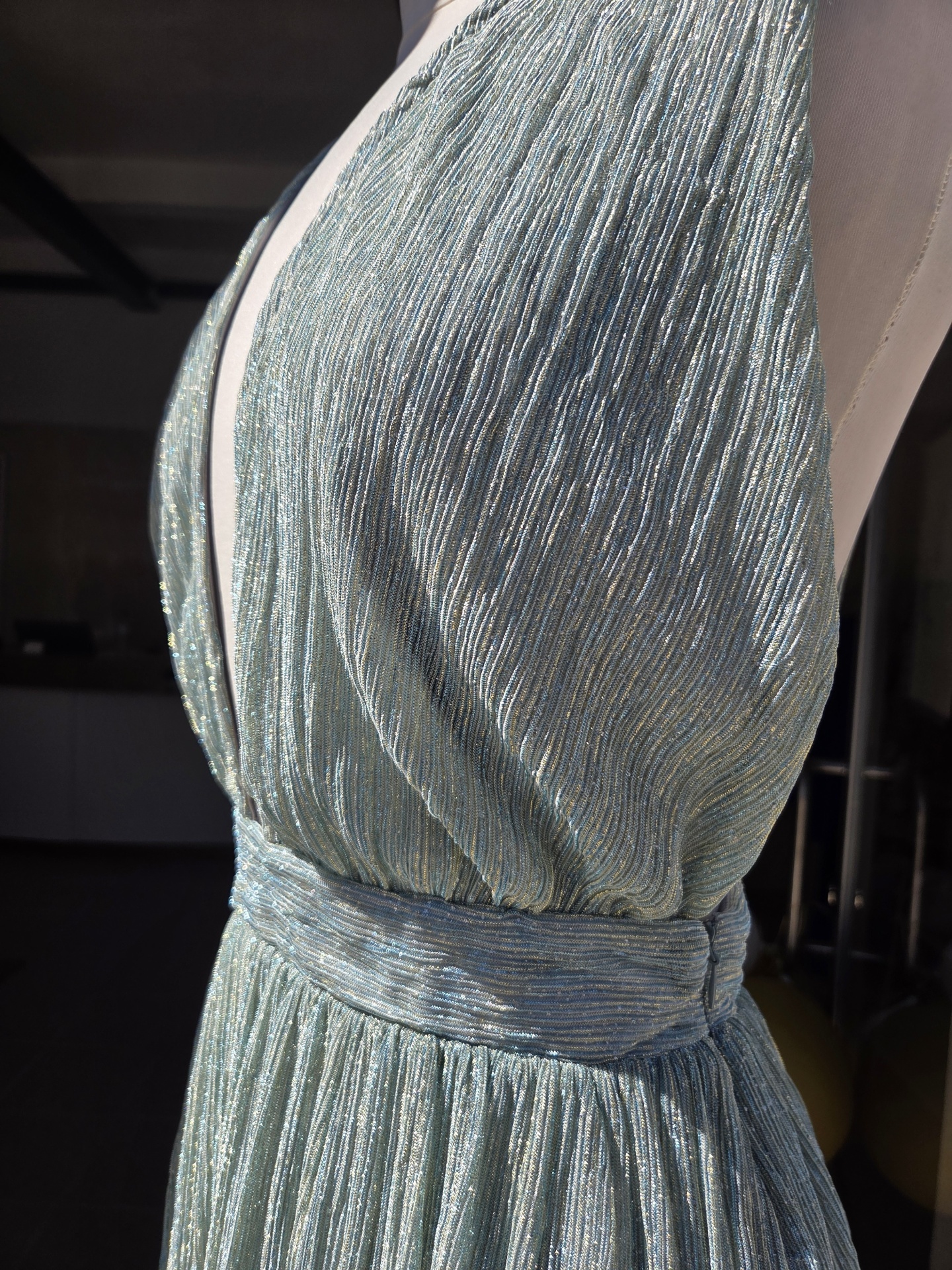 Num tom de verde esmeralda brilhante, esta peça combina a sofisticação do tecido plissado com um decote acentuado que valoriza o colo de forma audaz e elegante.